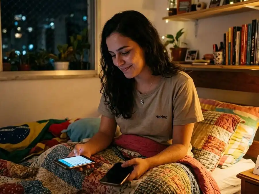 Pessoa desligando celular após chat com IA, expressão reflexiva e alívio, quarto brasileiro à noite com luz suave, simbolizando transição para apoio humano genuíno e uso consciente de tecnologia na saúde mental.